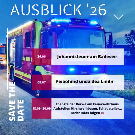 Die Jahreshauptversammlung 2026 findet am Samstag, den 10.01.2026 um 19.00 Uhr im Feuerwehrgerätehaus Ebensfeld statt. Einladung mit den Tagesordnungspunkten folgt ...